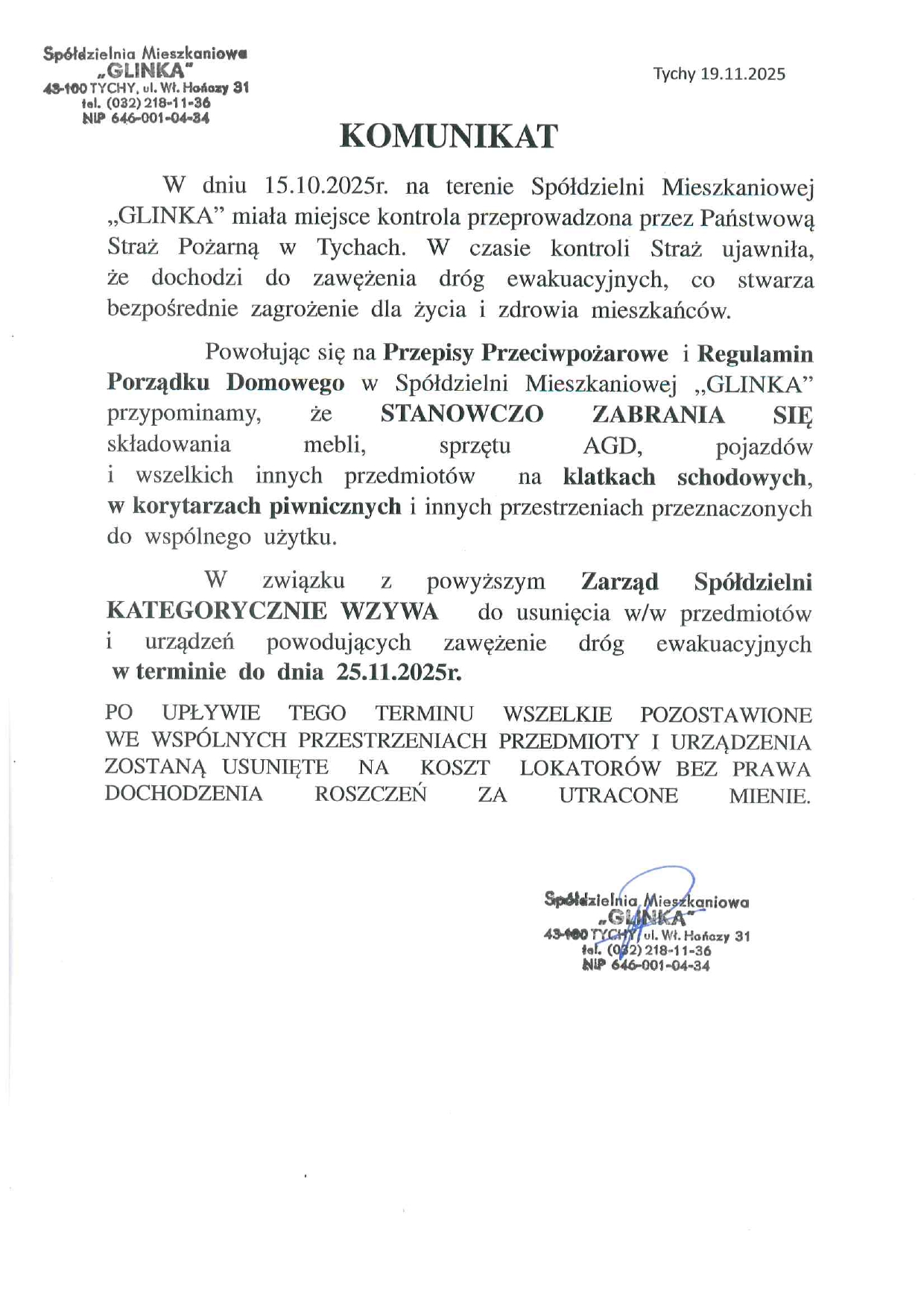Spółdzielnia Mieszkaniowa „GLINKA” uprzejmie zawiadamia, że od dnia 01.09.2025 r. należy dokonywać wpłat z tytułu opłat oraz rozliczeń za użytkowanie lokalu mieszkalnego na indywidualny numer rachunku bankowego. Zawiadomienie o nowym numerze rachunku bankowego zostało Państwu przekazane do skrzynek pocztowych w dniu 22.08.2025r. Dla osób zainteresowanych istnieje możliwość wydrukowania blankietów do wpłat […]